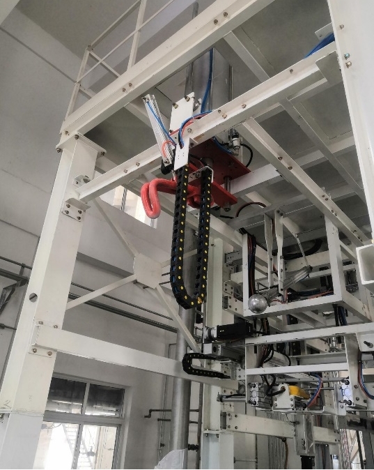 封口完成的吨袋,从封口工位输送至吨袋整袋机构,当吨袋到达整袋工位后,系统控制吨包提升气缸下降,当下降到最低位置时,吨袋挂钩气缸动作勾住吨袋,把吨袋向上吊起,当吨包提升气缸到达最高点时,系统控制吨包收袋口气缸执行收袋口动作。收袋口完毕后,吨包提升气缸下降至中位,吨袋挂钩气缸松开吨袋,完成一次动作。
