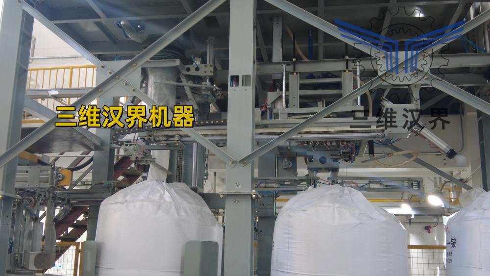封口完成的吨袋,从封口工位输送至吨袋整袋机构,当吨袋到达整袋工位后,系统控制吨包提升气缸下降,当下降到最低位置时,吨袋挂钩气缸动作勾住吨袋,把吨袋向上吊起,当吨包提升气缸到达最高点时,系统控制吨包收袋口气缸执行收袋口动作。收袋口完毕后,吨包提升气缸下降至中位,吨袋挂钩气缸松开吨袋,完成一次动作。